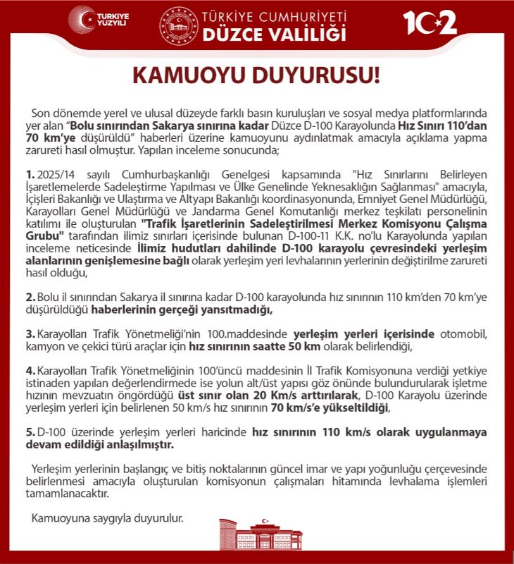 Son günlerde bazı basın ve sosyal medya paylaşımlarında, “Bolu’dan Sakarya’ya kadar Düzce sınırları içindeki D-100 Karayolu’nda hız sınırının 110 km’den 70 km’ye düşürüldüğü” yönünde haberler yer aldı. Düzce Valiliği, konuyla ilgili inceleme yaptı ve kamuoyunu doğru bilgilendirmek amacıyla açıklama yayımladı.