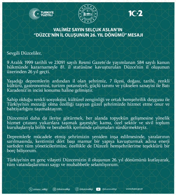 Türkiye’nin en genç vilayeti Düzcemizin il oluşunun 26. yıl dönümünü kutlayarak, tüm vatandaşlarımızı saygı ve muhabbetle selamlıyorum.