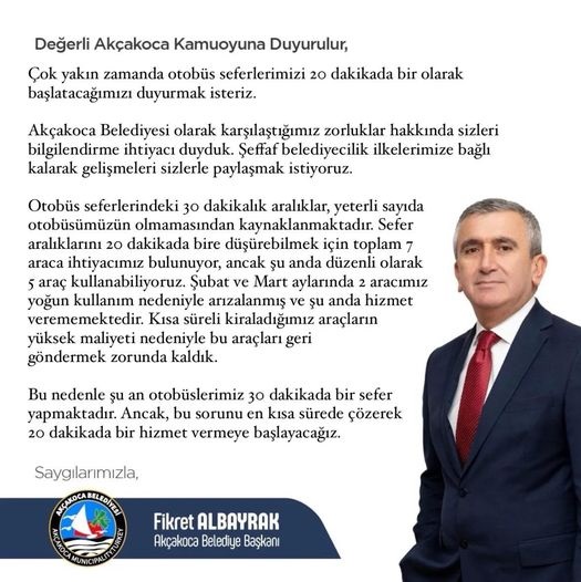 Akçakoca Belediye Başkanı Fikret Albayrak ilçe genelinde yaşanan şehir uyaşımı ile ilgili duyuruda bulundu. Albayrak, şehir içindeki ulaşımın ekonomik sıkıntılara rağmen şehir içindeki ulaşımın ksalacağı konusunda açıklama yaptı.