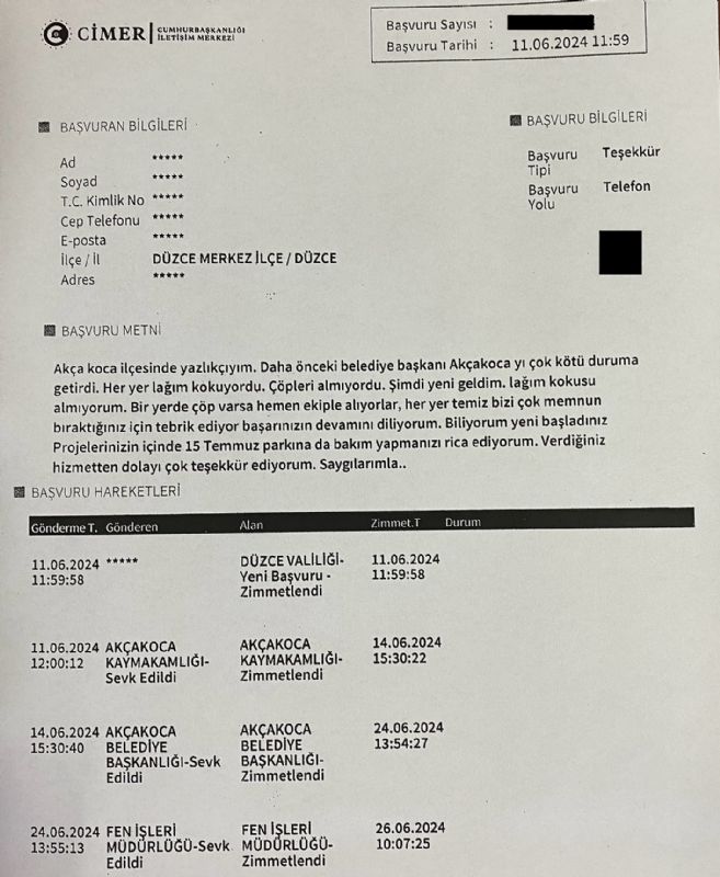 Akçakoca Belediyesi, CİMER (Cumhurbaşkanlığı İletişim Merkezi) aracılığıyla gelen bir teşekkür mesajı aldı. Akçakoca Belediye Başkanı Fikret Albayrak, vatandaşlardan gelen bu olumlu geri bildirimin kendilerini çok mutlu ettiğini belirtti.