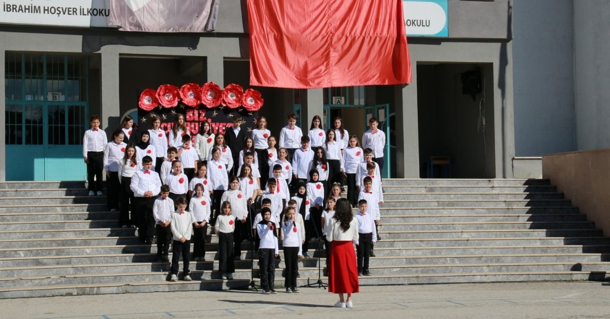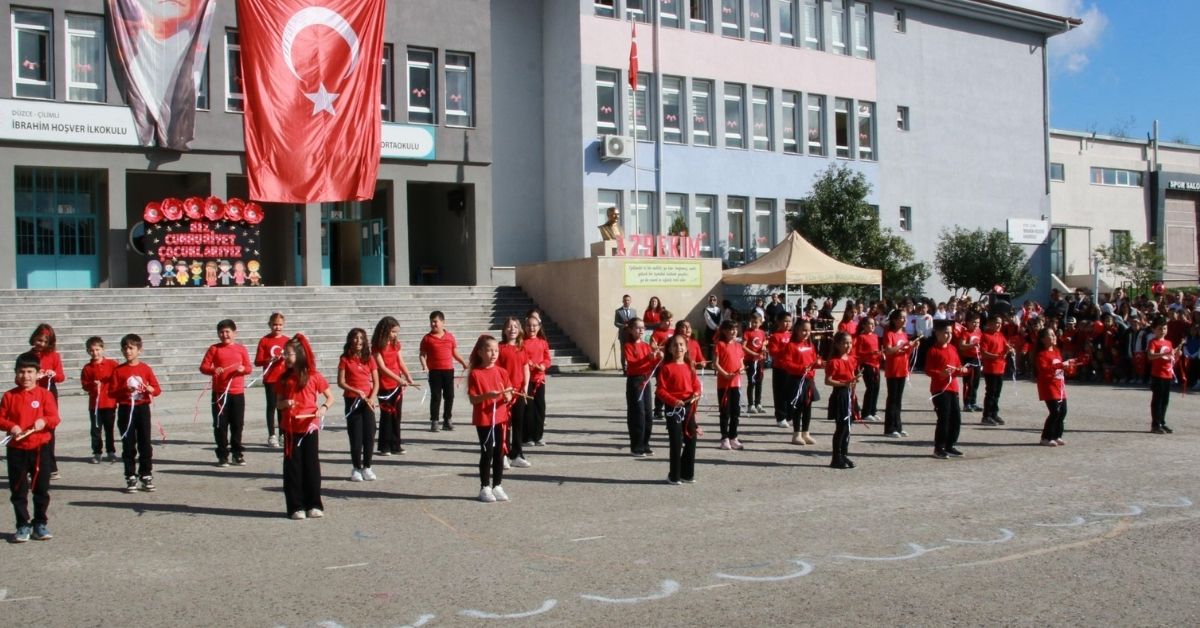 Okul bahçesinde düzenlenen törende öğrenciler tarafından şiirler, oratoryo gösterileri ve halk oyunları sergilendi. Öğrencilerin Cumhuriyet temalı performansları, izleyenlerden büyük alkış aldı.