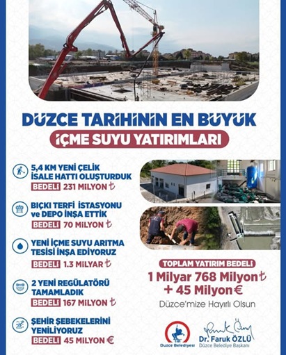 Toplam yatırım bedelinin 1 milyar 768 milyon TL ve 45 milyon Euro olduğu dev proje tamamlandığında, Düzce’nin içme suyu altyapısı uzun yıllar boyunca sorunsuz hizmet verecek hale gelecek.