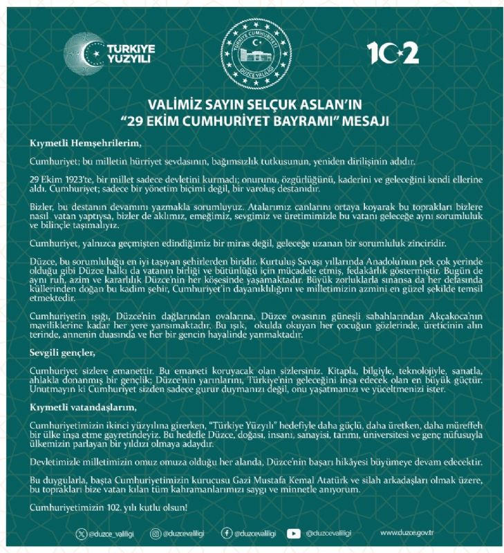 Cumhuriyet sizlere emanettir. Bu emaneti koruyacak olan sizlersiniz. Kitapla, bilgiyle, teknolojiyle, sanatla, ahlakla donanmış bir gençlik; Düzce’nin yarınlarını, Türkiye'nin geleceğini inşa edecek olan en büyük güçtür. Unutmayın ki Cumhuriyet sizden sadece gurur duymanızı değil, onu yaşatmanızı ve yüceltmenizi ister. Kıymetli vatandaşlarım, Cumhuriyetimizin ikinci yüzyılına girerken, “Türkiye Yüzyılı” hedefiyle daha güçlü, daha üretken, daha müreffeh bir ülke inşa etme gayretindeyiz.