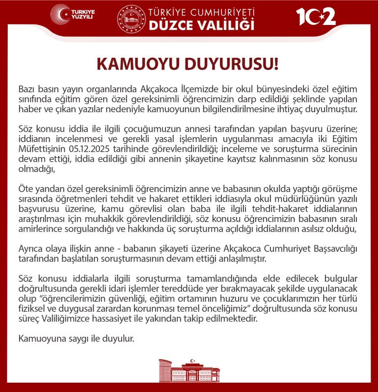 Düzce Valiliği, Akçakoca’da bir okulun özel eğitim sınıfında öğrenim gören özel gereksinimli bir öğrencinin darbedildiğine ilişkin bazı basın yayın organlarında yer alan haberler üzerine kamuoyunu bilgilendiren yazılı bir açıklama yaptı.