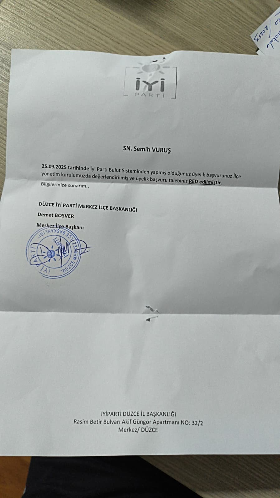 Ancak Vuruş, üyelik sürecinde dikkat çekici bir gelişme yaşandığını belirtti. Başvurusunun Merkez İlçe Başkanlığı tarafından önce kabul edildiğini, daha sonra ise tarihsiz ve kayıtsız bir evrak ile reddedildiğinin kendisine bildirildiğini ifade etti. Genel Merkez ile yaptığı görüşmelerde başvurusunun yaklaşık 50 gündür Yargıtay’a gönderilmeden bekletildiğini öğrendiğini dile getirdi.