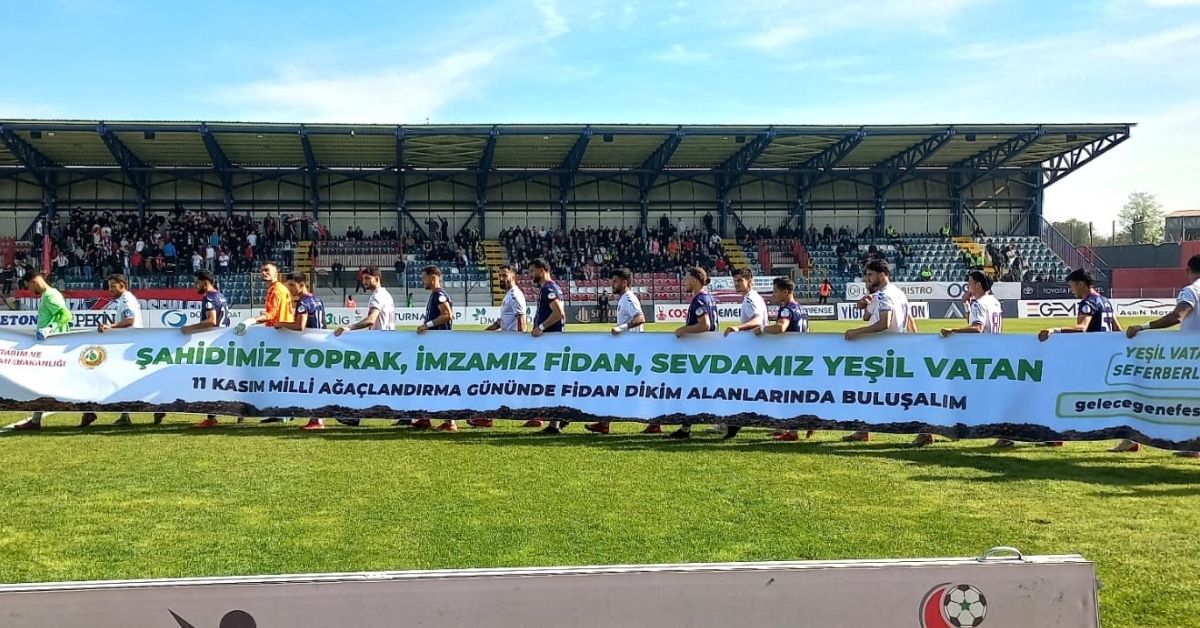 Her iki takım da müsabakaya, çevre bilincine vurgu yapan “Şahidimiz toprak, imzamız fidan, sevdamız yeşil vatan” yazılı pankartla çıktı.